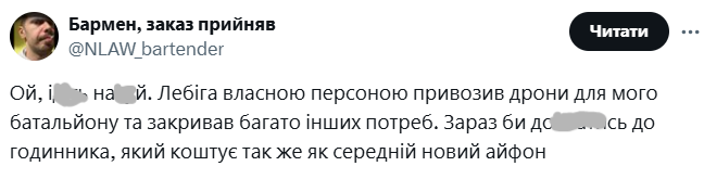 Інший користувач - @NLAW_bartender - додатково згадав про те, як Лебіга особисто привозив дрони для батальйону:
