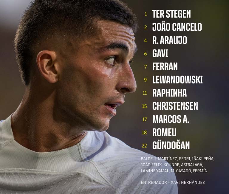 Барселона: 1. Марк-Андре тер Штеген (к) - 17. Маркос Алонсо, 15. Андреас Крістенсен, 4. Рональд Араухо, 2. Жоау Канселу - 6. Гаві, 18. Оріоль Ромеу, 22. Ілкай Гюндоган - 7. Ферран Торрес, 9. Роберт Левандовскі, 11. Рафінья