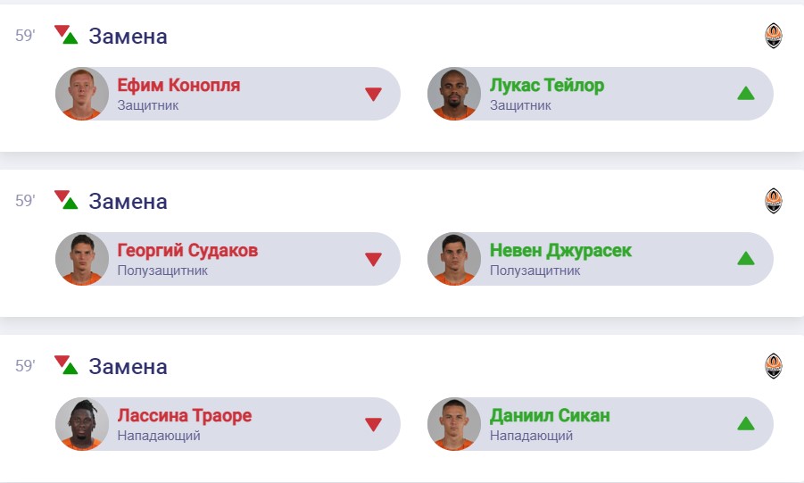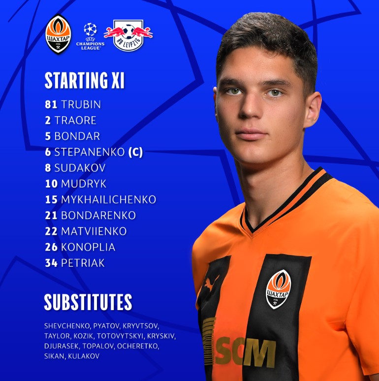 Шахтар: 81. Трубін - 26. Конопля, 5. Бондар, 22. Матвієнко, 15. Михайличенко - 8. Судаков, 6. Степаненко - 34. Петряк, 21. Бондаренко, 10. Мудрик - 2. Траоре