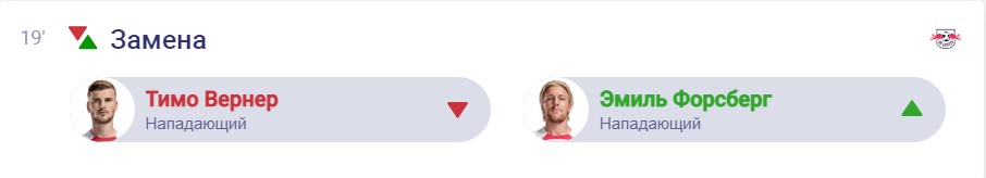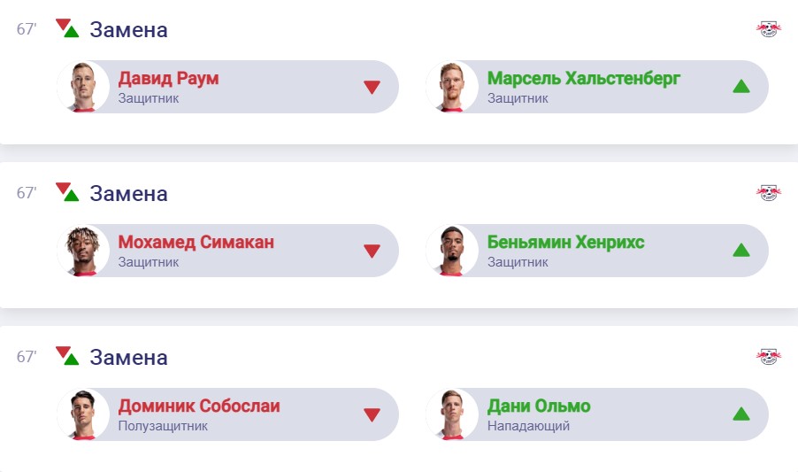 РБ Лейпциг: 21. Бласвіх - 22. Раум, 32. Гвардіол, 4. Орбан, 2. Сімакан - 11. Вернер, 44. Кампль, 24. Шлагер, 17. Собослаї - 19. Андре Сілва, 18. Нкунку
