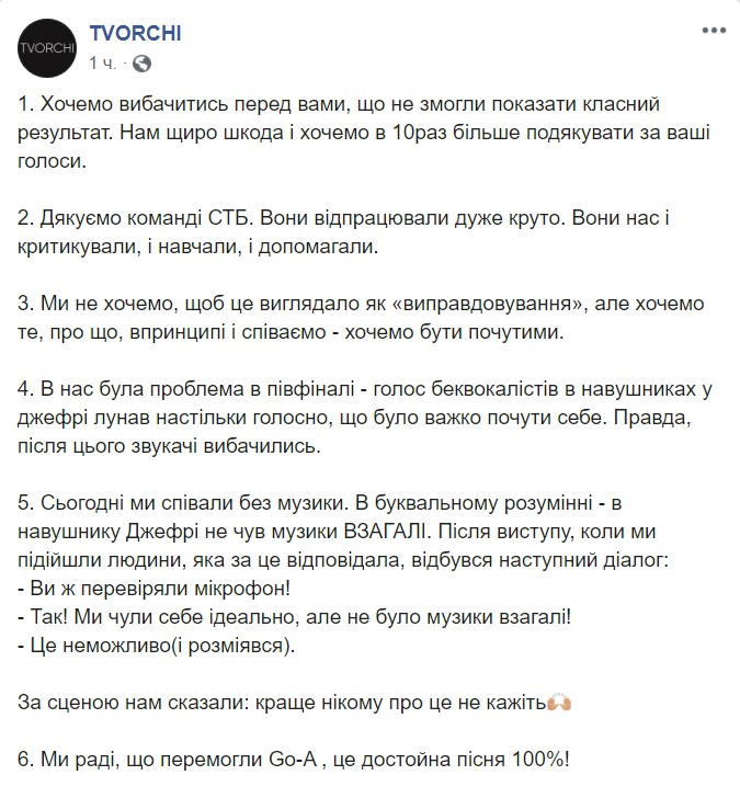 Звинувачувати когось у цій ситуації не хочеться. Дуже схоже, що хтось один дійсно помилився, але хто саме - ми, на жаль, вже не дізнаємося. Незабаром після фіналу TVORCHI також описали ситуацію на особистій сторінці в Фейсбук. Якщо виступ гурту дійсно зіпсував технічний нюанс, тоді їм хвилюватися нема чого. Ситуація прикра, але самі вони знають, що фаворитами відбіркового стали заслужено.