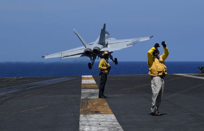 Винищувач FA-18 Hornet, під час навчань на борту американського авіаносця Theodore Roosevelt в Південно-Китайському морі