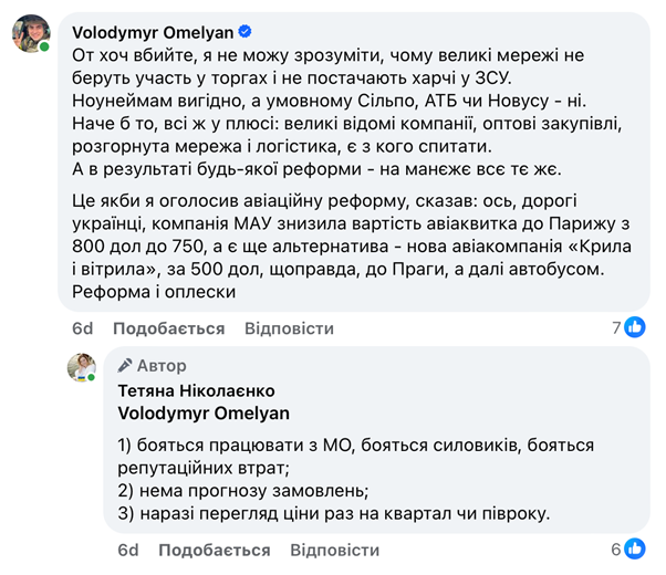 Володимир Омелян, колишній міністр інфраструктури, а зараз військовий, поставив питання: "Я не можу зрозуміти, чому великі мережі не беруть участь у торгах і не постачають харчі у ЗСУ".
