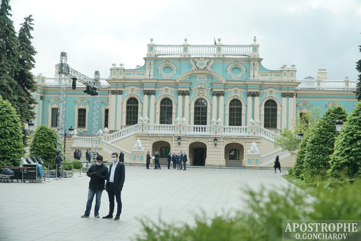 На вході в парк біля Маріїнського палацу, де і проходив захід учасників прес-конференції зустрічало три рівня захисту: у журналістів крім документів перевіряли температуру, наявність масок, а також просили надягати рукавички, які видала всюдисуща охорона. Такі нові реалії, викликані пандемією коронавірусу. Втім, на президента масковий режим не поширювався...
