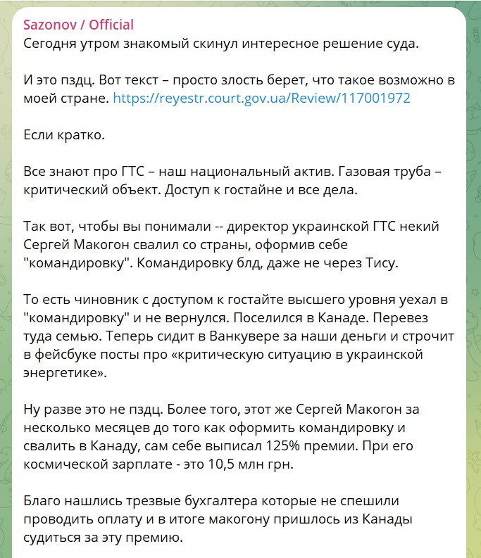 Якщо видумаєте, що Макогону соромно і він ховає від людей очі, то помиляєтесь. В соціальних мережах він активно викриває помилки влади в сфері енергетики. І, принагідно, через адвокатів намагається стягнути з України 10,5 млн. грн недоотриманої премії. Яку, за даними Кирила Сазонова, він сам собі виписав за кілька місяців до втечі.
