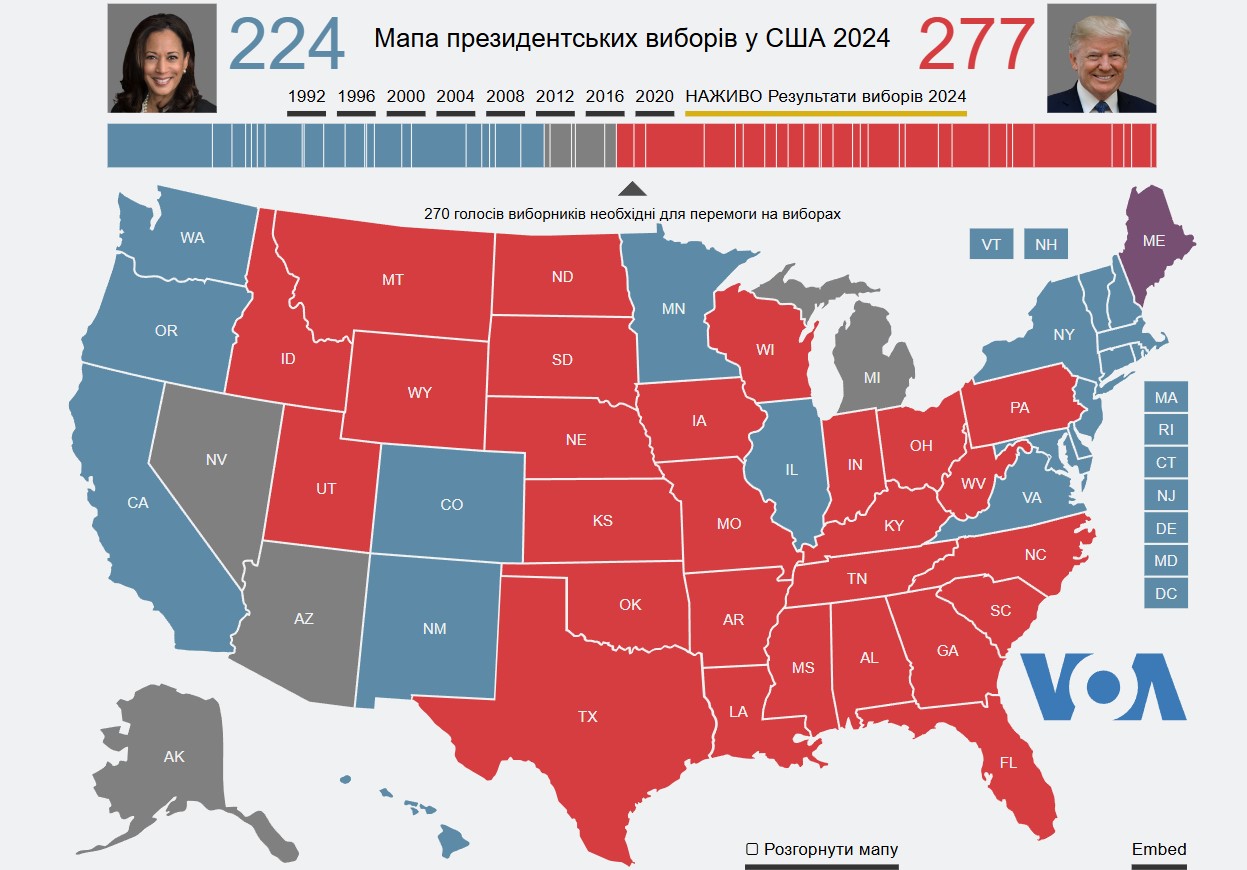 Так, як передає Голос Америки, у Трампа станом на 13:18 за київським часом 277 голосів виборщиків, що забезпечує йому перемогу на цих виборах.