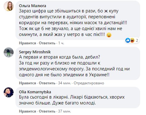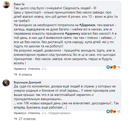 "Так цього слід було й очікувати. Свідомість людей - 0. Їдеш в транспорті - кілька принципових без масок завжди, про дітей взагалі мовчу, хоч цій дитині 4 рочки, хоч 13 - вони ж діти, їм не треба", "Так, судячи з коментарів, в країні ще багато людей, у яких не померли рідні і близькі від цієї зарази... У мене прикладів вже хоч греблю гати, так що я за жорстокий карантин і примусову вакцинацію... Або 10 тис кожен новий день вже не вражає, дисиденти?.. Так вперед, Буковель ще працює", "Підтримую. Від відповідальності кожного українця залежить, як скоро закінчиться карантин, і ми перейдемо до нормального життя", "Зараз цифра ще збільшиться в рази, так як купу студентів випустили в аудиторії, переповнені коридори на перервах, ніяких масок і дистанції. Тому як це б не звучало, а ще однієї хвилі нам не оминути, а який жах в метро в годину пік", - пишуть українці в підтримку карантину.