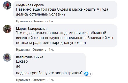 "Досить брехати людям і вигадувати всяку єресь. Нічого такого немає, ви вигадуєте, тому що вам вигідно щемить тих бідних людей, які ледь виживають", "Ні не підтримую. Чому, тому що завищені ціни на продукти харчування, ну і, звичайно, захмарні тарифи. Де потім людям брати кошти щоб вижити, а вашої допомоги марно чекати", "Напевно ще три роки будемо в масці ходити. А куди поділися інші хвороби?", "Це знущання над людьми. Почався звичайний весняний сезон повітряно-крапельних захворювань. Ми не знаємо заради чого народ так принижують", - заявляють його противники.
