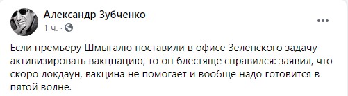 "Якщо прем'єру Шмигалю поставили в офісі Зеленського завдання активізувати вакцинацію, то він блискуче впорався: заявив, що скоро локдаун, вакцина не допомагає і взагалі треба готуватися до п'ятій хвилі", - написав столичний журналіст Олександр Зубченко.