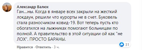 "Коли в січні всіх закрили на жорсткий локдаун, вирішили, що курорти не беруться до уваги. Буковель стала рознощиком коронавірусу. Ось тепер нехай ті, хто збагатився на лижниках, допомагають лікарням по повній", - обурюється житель Запорізької області Олександр Валюх.