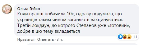 "Коли вранці побачила 10 тис, відразу подумала, що українців таким чином заганяють вакцинуватися. Третій локдаун, до якого Степанов вже "готовий", добре в цю тему вкладається", - зазначає киянка Ольга Гейко.