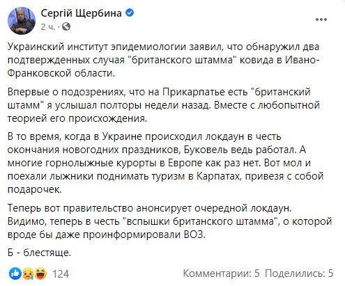 "У той час, коли в Україні відбувався локдаун в честь закінчення новорічних свят, Буковель адже працював. А багато гірськолижних курортів в Європі якраз ні. Ось мовляв і поїхали лижники піднімати туризм в Карпатах, привізши з собою подаруночок. Тепер ось уряд анонсує черговий локдаун. Мабуть, тепер в честь "спалаху британського штаму", про який начебто навіть поінформували ВООЗ", - пише журналіст Сергій Щербина.
