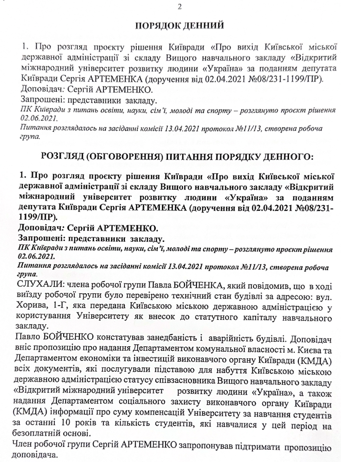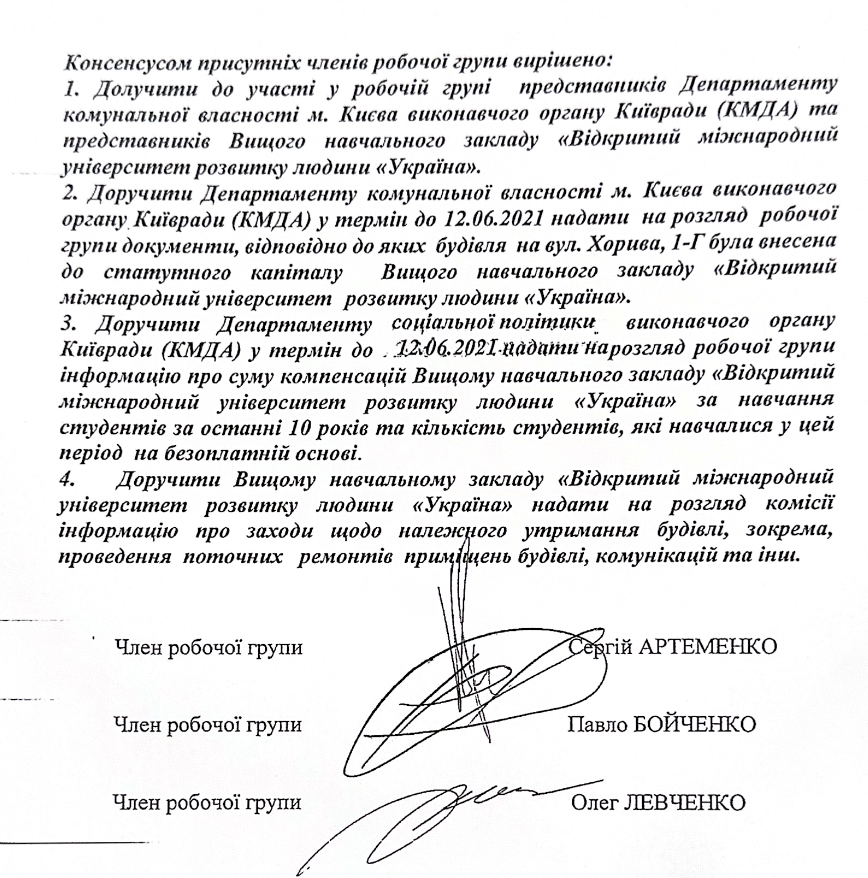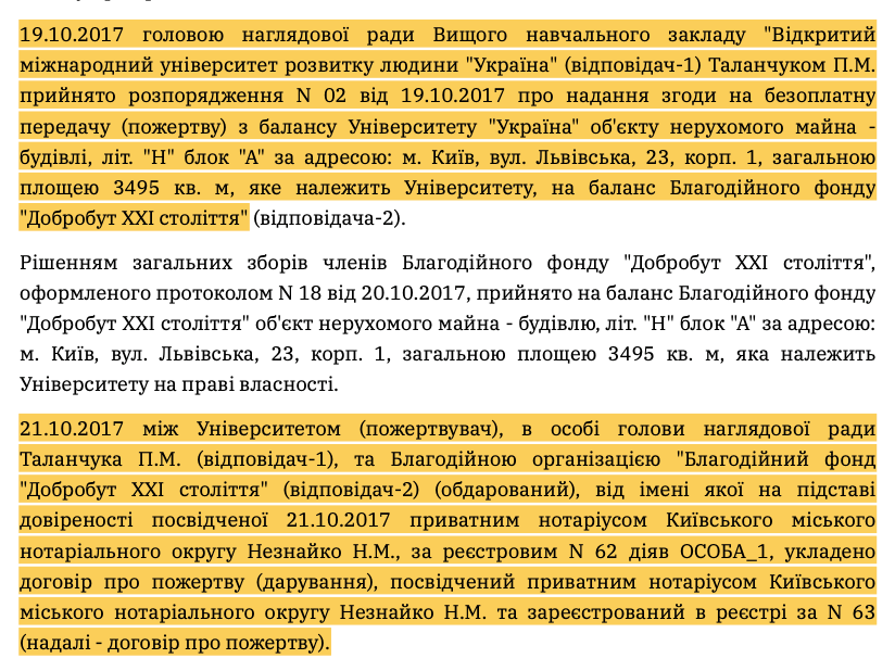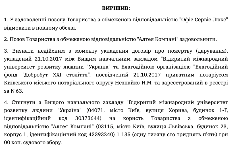 Частина цих оприлюднених фактів дає підстави для висновку про те, що керівництво університету "Україна", ймовірно, своїми діями не виконало основоположної функції організації процесу навчання, бо саме з цією метою було передано приміщення і замість цього, вірогідно, дивним чином зареєструвало фірми та благодійний фонд не поінформувавши та не спитавши думки КМДА. Звідси напрошується висновок, що навчання, скоріше за все, це лише прикриття для отримання приміщення, а які насправді цілі переслідує керівництво можна лише здогадуватися.