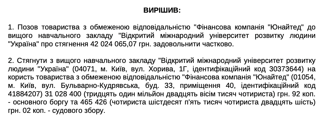 Проаналізувавши ці дві справи стає очевидним, що університет уклав з ПАТ "Комерційний банк "Хрещатик" кредитні договори на 13 млн грн та 30 млн. грн, відповідно, очікувавши на відшкодування відповідачами 75% суми відсотків за цими кредитними договорами, не сплачував їх, а в кінцевому результаті став єдиним боржником за цими кредитними договорами та відсотками по ним.