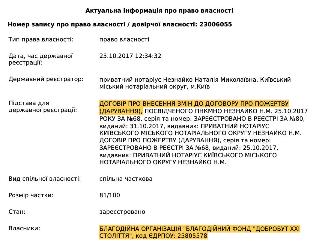 Починаючи з 2011 року, без згоди виконавчого органу Київської міської ради, цей благодійний фонд було зареєстровано у будівлі Київської міської державної адміністрації на Хорива 1-гі розміщено там Правління Благодійного фонду "Добробут ХХІ століття".
