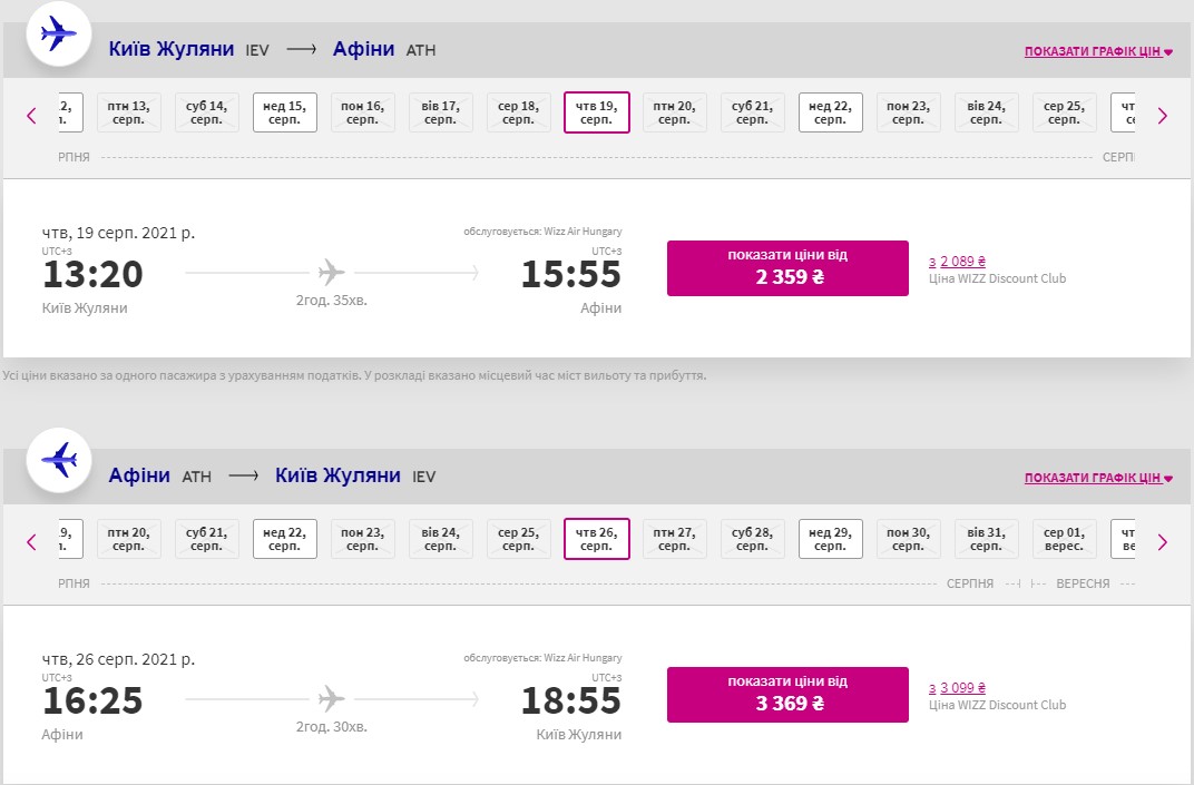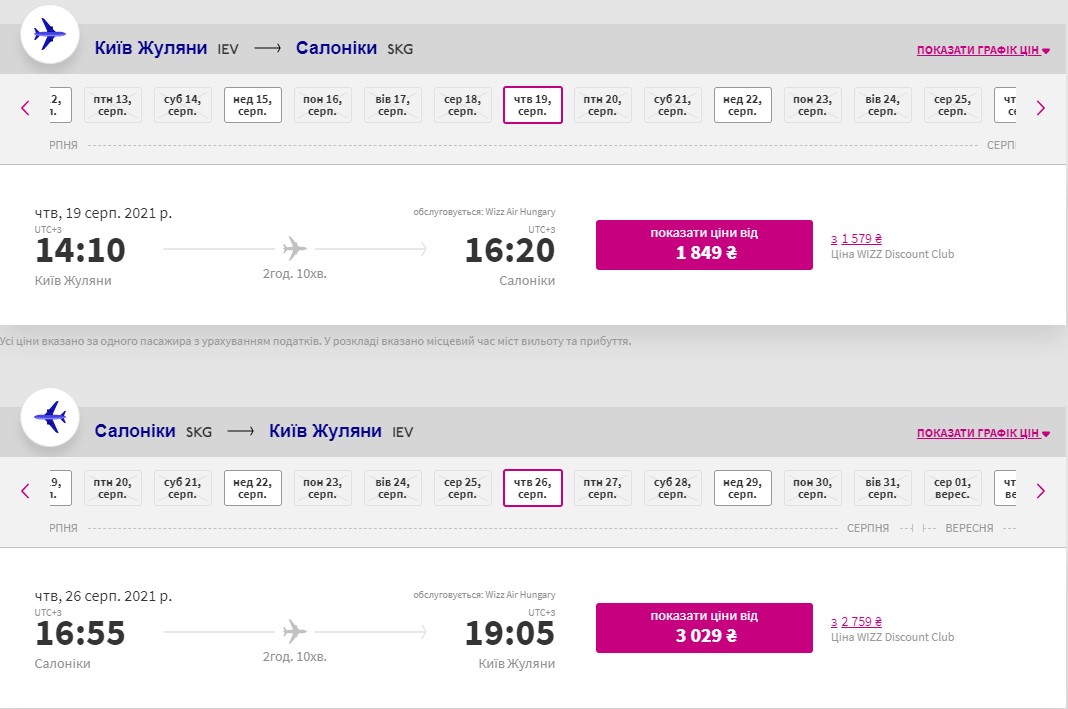 Ще один лоукостер Wizz Air літає з Києва до Афін (туди 2360 гривень, назад 3370 гривень) і Салоніки (туди 1850 гривень, назад 3030 гривень).