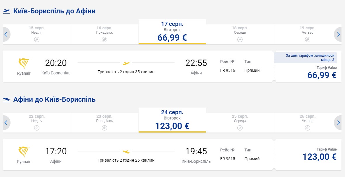 Наприклад, Ryanair з Києва літає в Афіни і Ханью (о. Крит). Ціни на авіапереліт на серпень з Києва до Афін коштує 70 євро (близько 2260 гривень), а назад - 123 євро (близько 3971 гривень).
