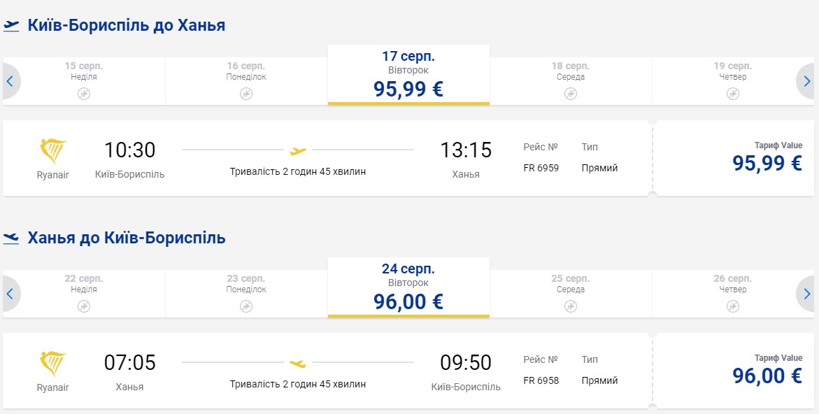 У Ханью вартість перельоту буде 96 євро, також і назад (близько 3100 гривень).