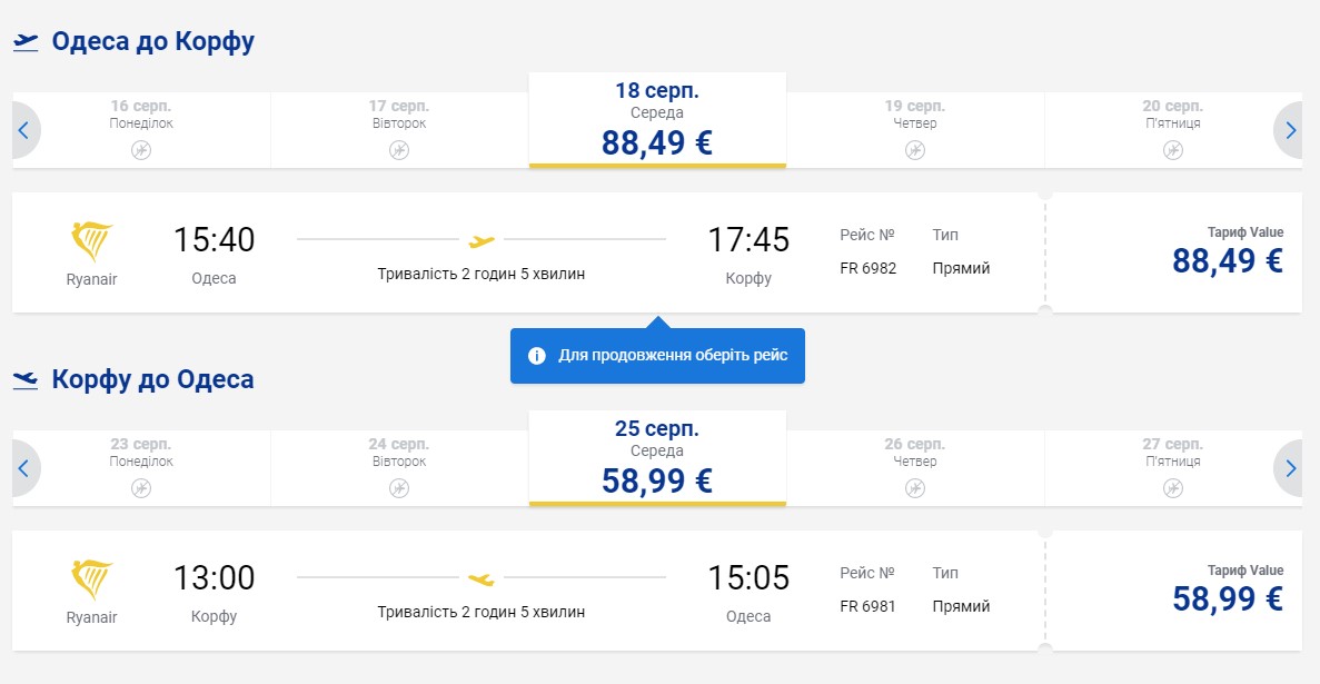 З Одеси Ryanair можна полетіти на острів Корфу, ціна туди становитиме 88,5 євро (близько 2840 гривень), назад - 59 євро (близько 1900 гривень).