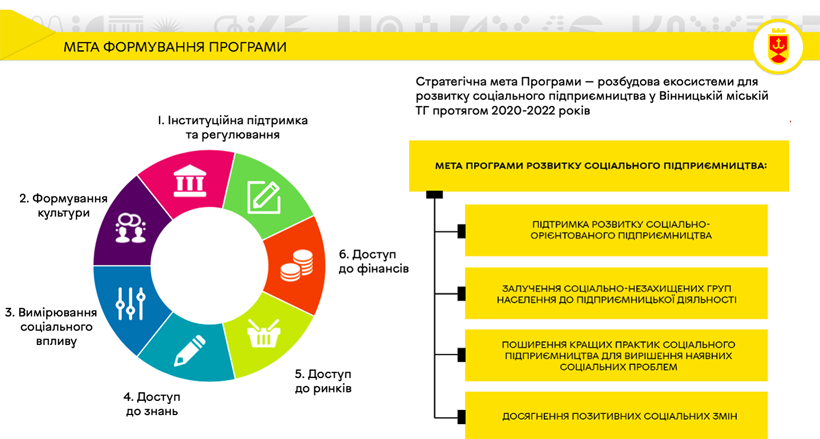 У 2017 році Вінницька міська рада визначила, що соціальне підприємництво буде одним із пріоритетів розвитку міста. Згодом почали готувати профільну програму. Долучився департамент економіки і інвестицій, державні установи, соціальні підприємці, представники місцевого бізнесу, громадські організації, бізнес-об"єднання та місцеві жителі. А експертну підтримку забезпечує команда Проєкту міжнародної технічної допомоги "Партнерство для розвитку міст" (ПРОМІС). Після 9 місяців фокус-групових досліджень, вивчення проблеми, розробки плану заходів у червні 2020 року програму прийняли.