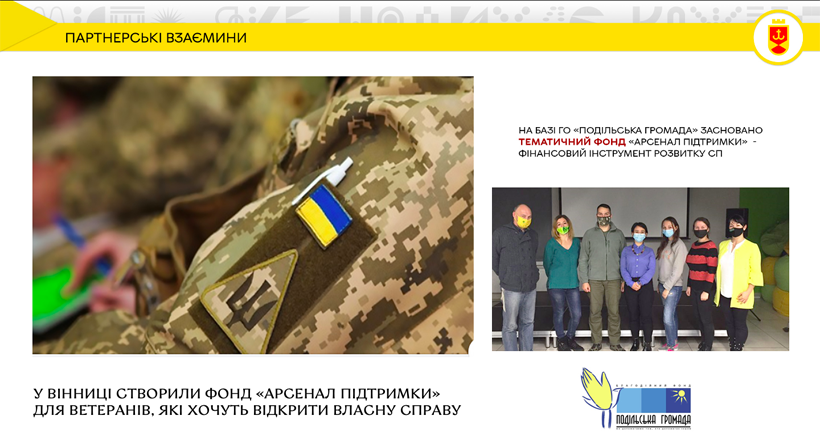 Також у місті створюють абсолютно нові фінансові інструменти. Зокрема, тематичний фонд "Арсенал підтримки" для розвитку ветеранського бізнесу. Його наповнює місцевий бізнес, діючі соціальні підприємці тощо. Фонд видає гранти на запуск власної справи для ветеранів і членів їх родин. Зібрані фондом кошти вкладають у відкриття ветеранського бізнесу. А підприємці-ветерани, які за ці гроші відкриють свій бізнес, щомісяця віддаватимуть до фонду частину свого прибутку, наповнюючи його та запускаючи інші ветеранські бізнеси.