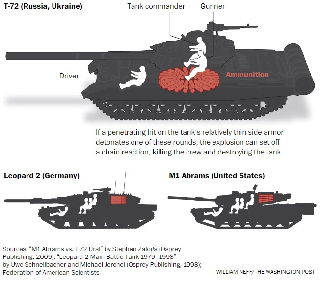 Погіршує ситуацію й спосіб зберігання боєприпасів поза каруселі автомата заряджання. Цей пристрій містить 22 снаряди, а максимальна місткість боєкомплекту Т-72Б (і всіх подальших модифікацій) становить 45 снарядів. Додаткові снаряди зберігаються, в основному, біля моторного відсіку та борту корпусу та, у разі ураження, вибухають найчастіше. Подібний недолік, на жаль, характерний й для танків радянської конструкції, які знаходяться на озброєнні української армії.
