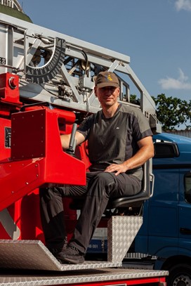 Геннадій Вовк у пожежній машині, переданій рятувальникам на Донеччині, серпень 2023 року