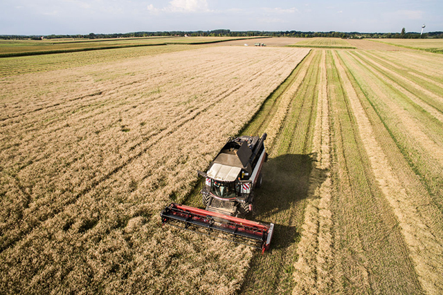 ЗеЗерноуборочний комбайн проїжджає пшеничне поле під час літнього збору врожаю, Угорщина