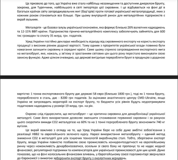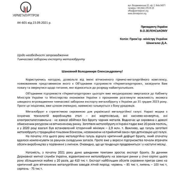 "З початку 2021 року швидкими темпами зростає експорт брухту. За даними Державної митної служби України, відвантаження металобрухту на зовнішні ринки в січні-серпні цього року збільшилися майже в 20 разів, до 410 тис. т", - йдеться в листі.