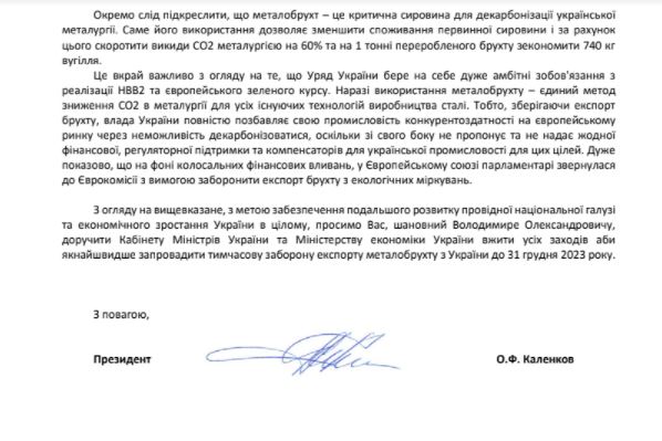 Об'єднання підприємств "Укрметалургпром" у своєму листі на ім'я президента Володимира Зеленського і прем'єра Дениса Шмигаля просить розглянути можливість якомога швидше ввести заборону на експорт металобрухту з України до 31 грудня 2023 року.