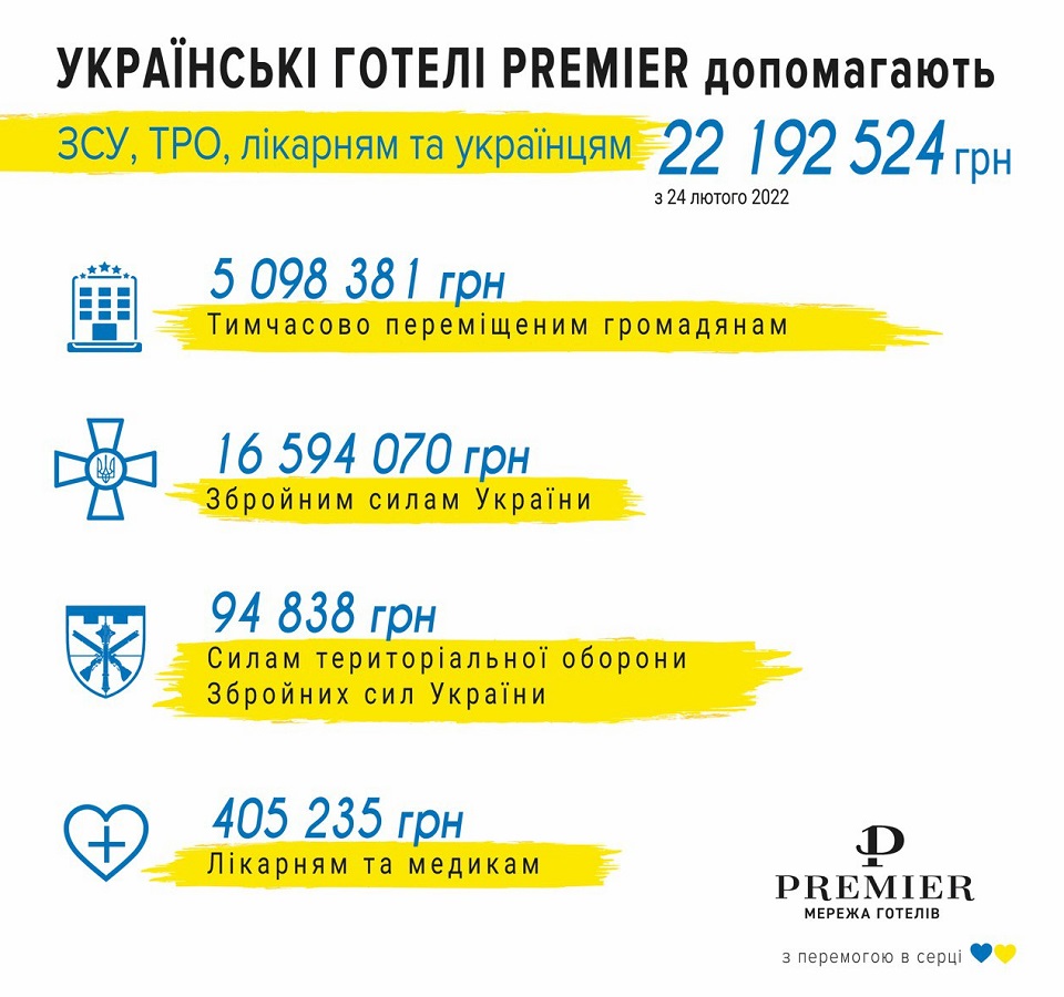 Один зі співвласників групи компаній, латвійський інвестор Віліс Дамбінс заявив: "Наш готельний бізнес заснований на принципах турботи про людей. Ми залишаємось вірними цим принципам і під час війни, активно допомагаючи Україні та українцям. Готелі Premier активно співпрацюють з українськими та міжнародними гуманітарними організаціями, органами влади, волонтерськими ініціативами та місцевими громадами задля нашої спільної перемоги. Наші гуманітарні ініціативи та проекти охоплюють десятки тисяч українців, що постраждали від війни, а також тих, хто боронить рідну землю від російської агресії".