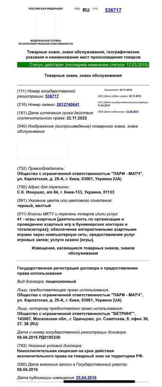 Торгова марка букмекерської компанії Parimatch "досі активна в Росії", пише РБК-Україна з посиланням на інформацію на сайті Роспатенту.