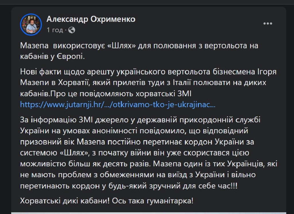 Обвинувачений у створенні фінансової піраміди Forex PrivateFX бізнесмен Ігор Мазепа, вертоліт якого арештували в Хорватії під час незаконного приземлення на одному з полів ферми Šumbar, що літав туди нібито з метою полювання на диких кабанів, перетнув кордон України за системою "Шлях" з метою доставки гуманітарної допомоги в Україну.