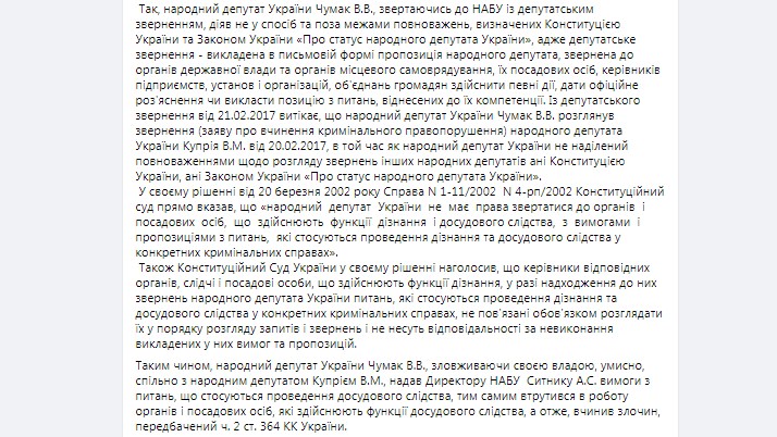 Таким чином, відзначає вона, нардеп Чумак, зловживаючи владою, спільно з Купрієм В.М., надав директору НАБУ Ситнику А.С. вимоги з питань, що стосуються проведення досудового слідства.