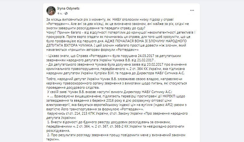 За словами адвоката, справа "Роттердам+" була порушена 24.03.2017 за депутатським зверненням депутата Чумака від 21.02.2017. До звернення була долучена заява від 20.02.2017 про вчинення кримінального правопорушення, передбаченого ч. 2 ст. 364 КК України, яка підписана народним депутатом Купрієм В.М. та подана до директора НАБУ Ситника А.С.
