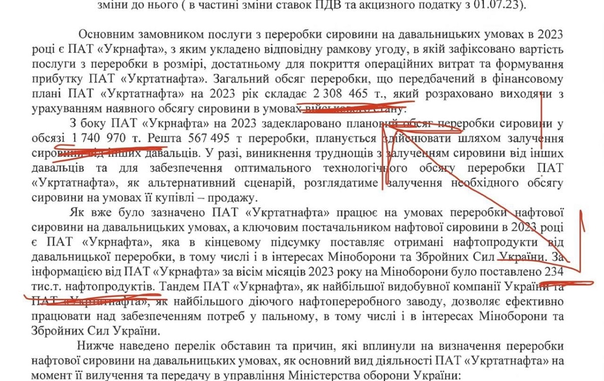 Експерт зазначив, що на адресу Міноборони у 2023 поставили лише 234 тис. тонн нафтопродуктів, а виробили їх за цей період в 5 разів більше, і вказав на абсурдність ситуації довкола "Укртатнафти" і "Укрнафти": "Ставка верховного головнокомандувача вилучає частину (міноритарну) акцій "Укрнафти" у власність військових під гаслами забезпечення пальним ЗСУ, в той час, коли компанія тільки добуває нафту і не є виробником… "Укрнафта" забирає собі з заводу всі прибутки, які піарить як свої досягнення, а на адресу військових, для яких начебто й вилучалися ці акції, відвантажує лише 20% (!!!) з отриманих від переробки нафтопродуктів, при тому за ринковими цінами, ще й накрутивши мільярд ПДВ... Привезти 250-300 тис. тонн пального на рік (20-25 тис т/місяць) і поставити за ринковими цінами на адресу Міноборони зміг би будь-який трейдер", – резюмує він.