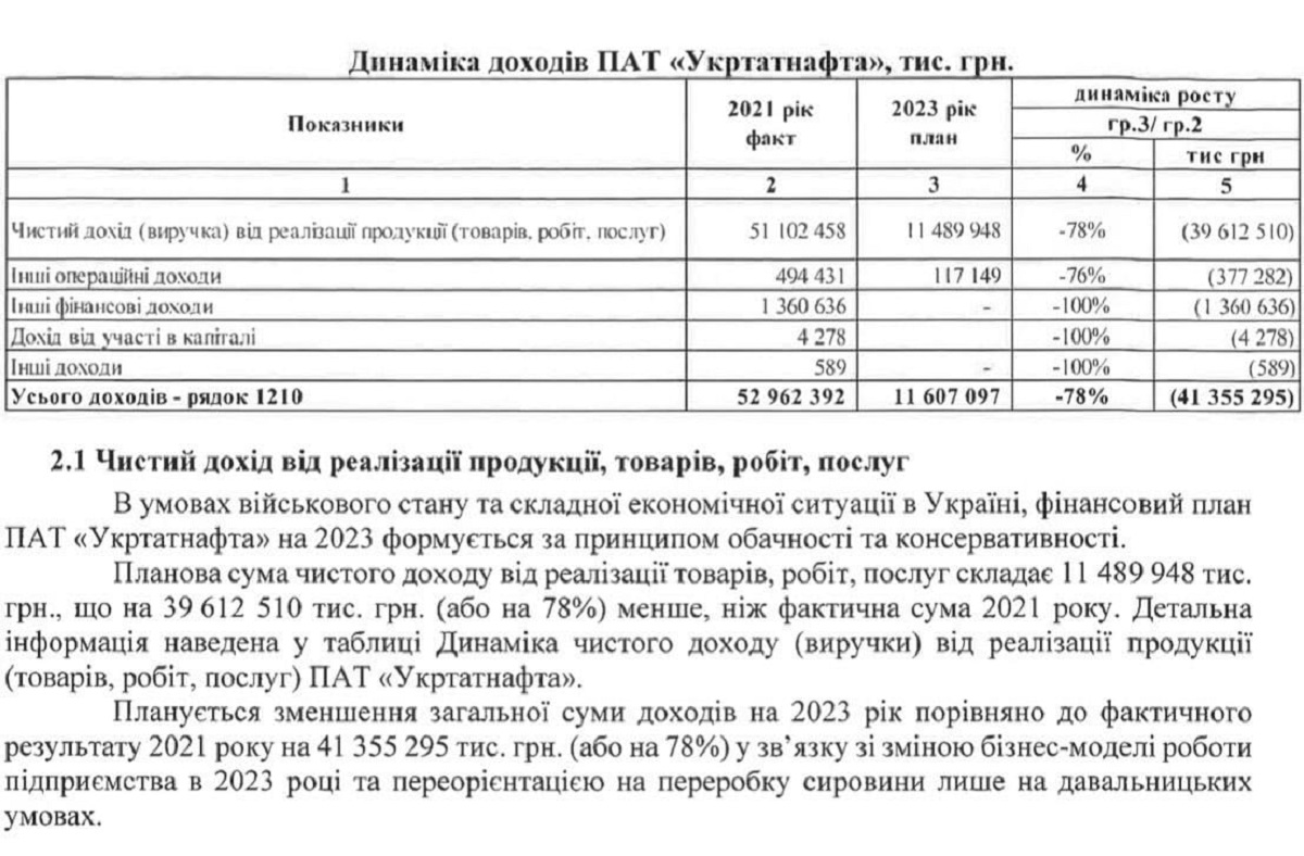 "При отриманому фактичному доході у 2021 в 52,96 млрд грн Міноборони просить затвердити в поданому фінплані на 2023 доходи "Укртатнафти" на рівні 11,49 млрд, що майже на 80% нижче ніж у довоєнному 2021, і при курсі долара на 40% нижче ніж зараз. Сукупний дохід "Укрнафти" у 2021 склав 37 млрд грн, а разом з 53 млрд "Укртатнафти" загальний дохід обох підприємств склав 90 млрд грн… У фінплані "Укрнафти" 2023 урядом затверджено дохід на рівні 94 млрд грн, що має створити ілюзію надлюдських менеджерських якостей Корецького", - пише Шнайдер.