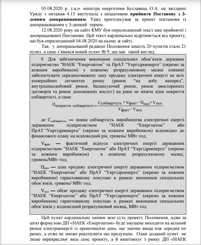 "5 серпня в.о. міністра енергетики Буславець на засіданні уряду... виступила з ініціативою прийняти постанову з 3-денним доопрацюванням... 12 серпня на сайті КМУ був оприлюднений текст уже прийнятої і доопрацьованої постанови. Цей текст кардинально відрізняється від проекту, який було оприлюднено 4 серпня", - пише депутат.