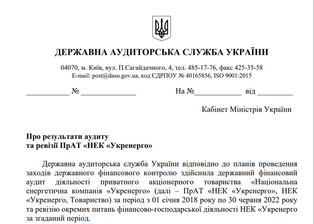 "Ревізійними діями встановлено, що фактична вартість робіт, які виконувалися субпідрядниками для зазначених підприємств-підрядників, з якими НЕК "Укренерго" уклало контракти, менша на 666,4 млн грн, ніж передбачено цими контрактами", – сказано в листі ДАС до Кабміну.