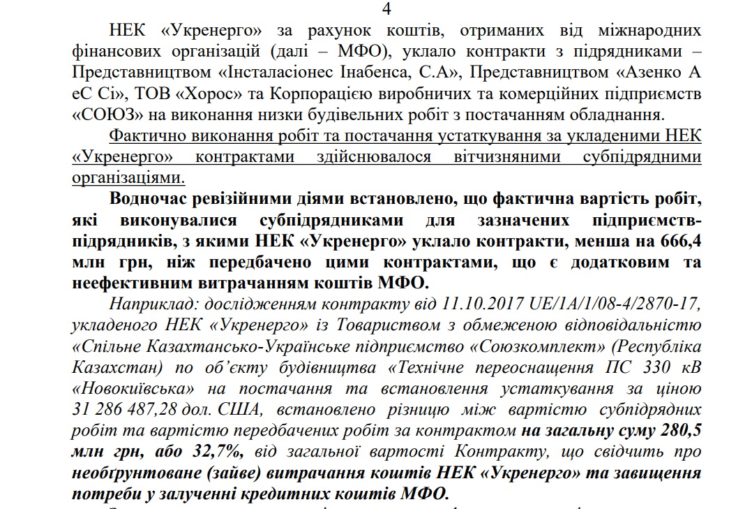 "Встановлено різницю між вартістю субпідрядних робіт та вартістю передбачених робіт за контрактом на загальну суму 280,5 млн грн, або 32,7%, від загальної вартості контракту, що свідчить про необґрунтоване (зайве) витрачання коштів НЕК "Укренерго" та завищення потреби у залученні кредитних коштів МФО", – йдеться в звіті аудиторів.