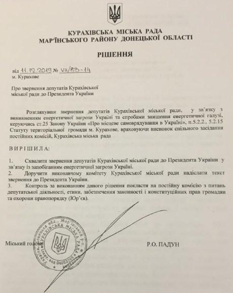"Направляючи кошти з України, голова Комітету Герус А.М. власними руками почав вбивчу кампанію зі знищення української енергетики і економіки, оскільки чим більше української електроенергії було заміщено, тим більше можливостей стало для тиску на нашу країну", - зазначають депутати Курахівської міськради.