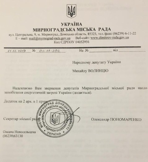"Це в той час, коли транзитний контракт між "Нафтогазом" і "Газпромом" закінчується 31 грудня і перед Україною гостро стоїть питання щодо забезпечення енергетичної безпеки. Ми надаємо країні-агресору додаткові важелі тиску на Україну, використовуючи енергетичні фактори залежності. На нашу думку, подібна ситуація є неприпустимою і свідчить про вчинення кримінального злочину проти держави головою комітету Герус А.М.", - йдеться в зверненні Мірноградскої міськради.