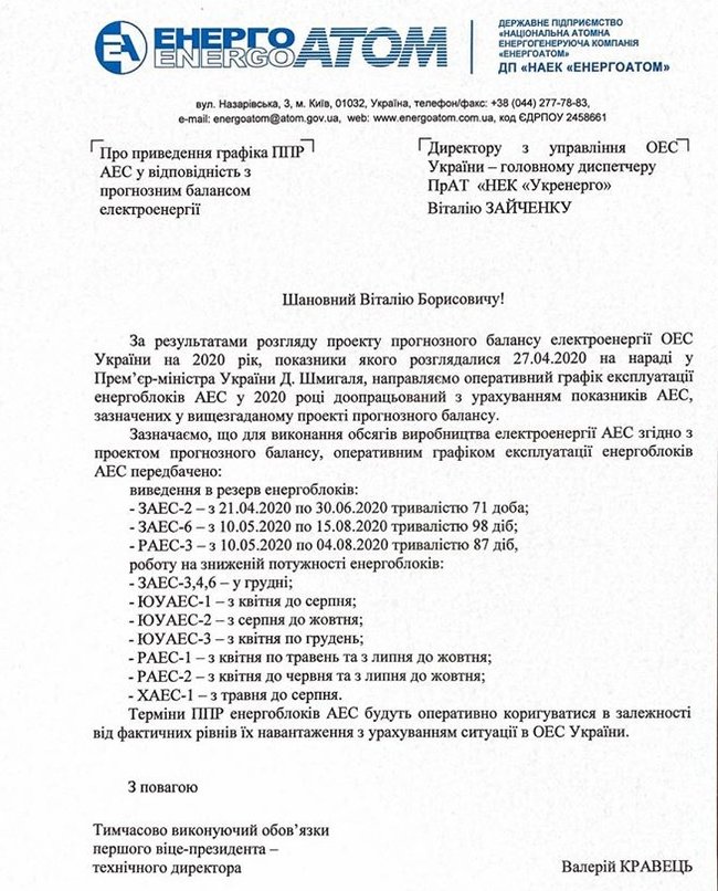 Зокрема, графіком передбачено виведення в резерв енергоблоків: ЗАЕС-2 - 71 добу, ЗАЕС-6 - 98 діб, РАЕС-3 - 87 діб.