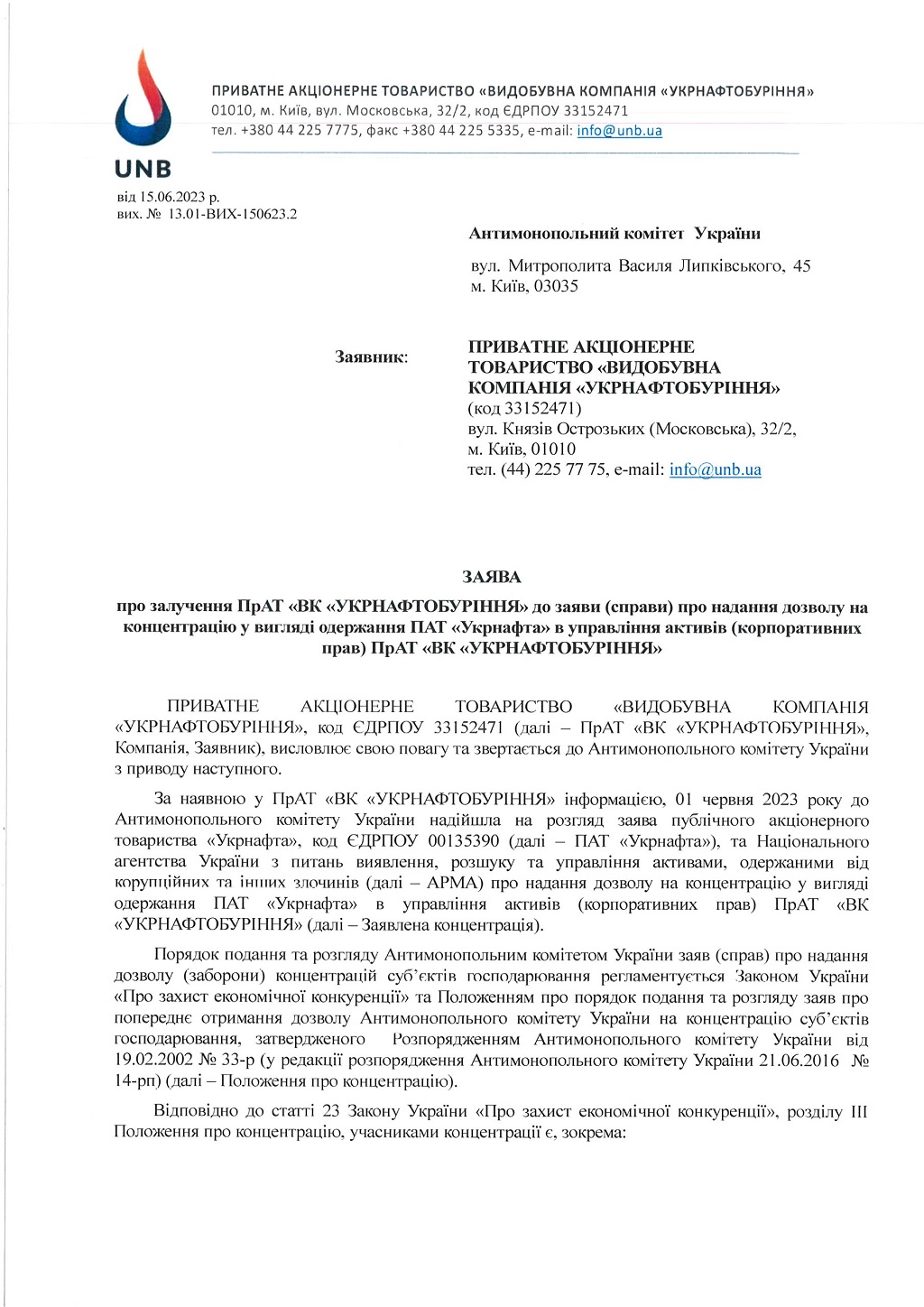 УНБ, як учасник концентрації, наполягає на залученні Компанії до заяви (справи) про надання дозволу на концентрацію, та готова надати до АМКУ всі необхідні документи та інформацію аби АМКУ змогло провести повне та неупереджене дослідження заяви.