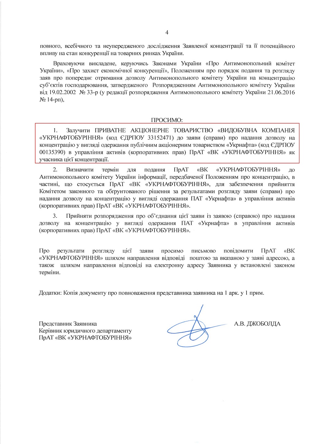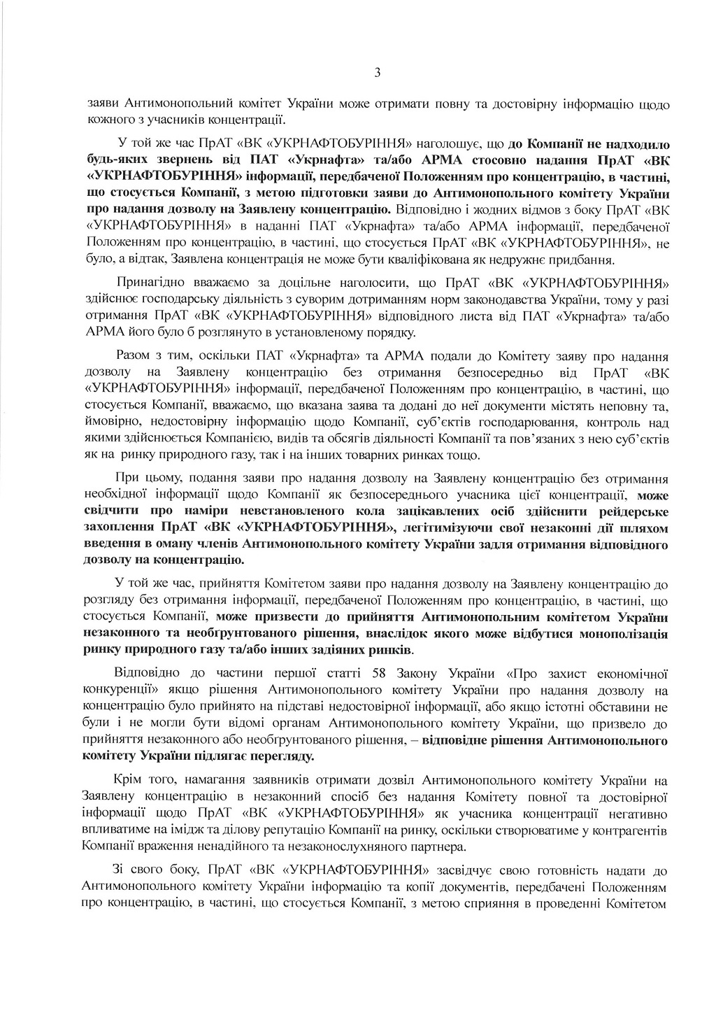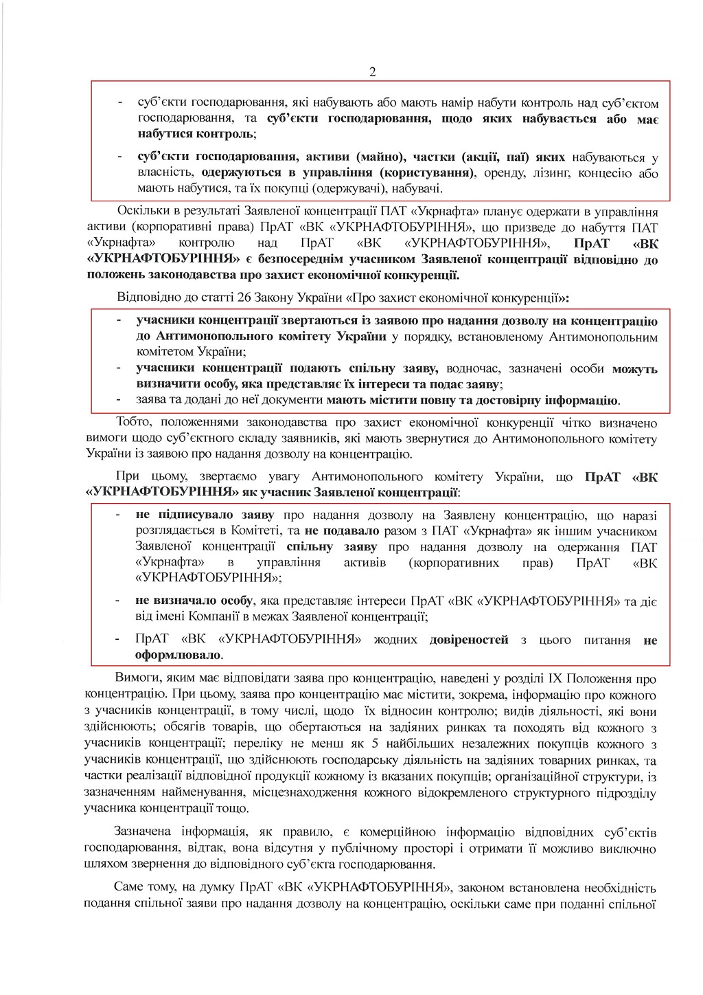 Як підкреслюють в "Укрнафтобурінні", згідно із ст. 23 та 26 ЗУ "Про захист економічної конкуренції", учасниками концентрації є компанії, які отримують контроль над певними активами чи то суб'єктами господарювання, а також самі компанії, над якими встановлюється цей контроль. При цьому учасниками концентрації до АМКУ подають спільну заяву відносно власне концентрації. Тобто, окрім заяви ПАТ "Укрнафта" та АРМА у їхній заяві повинна була бути представлена позиція "Укрнафтобуріння", котра погоджується на подібну концентрацію у вигляді хоча б підпису під заявою. Проте підпису з боку компанії не було.