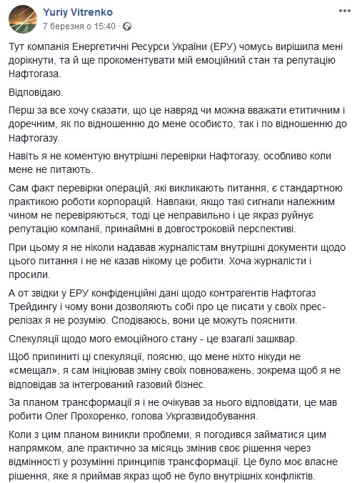"Мене ніхто нікуди не "смєщал", я сам ініціював зміну своїх повноважень, зокрема щоб я не відповідав за інтегрований газовий бізнес. За планом трансформації я і не очікував за нього відповідати, це мав робити Олег Прохоренко, голова "Укргазвидобування", - пояснив Вітренко.