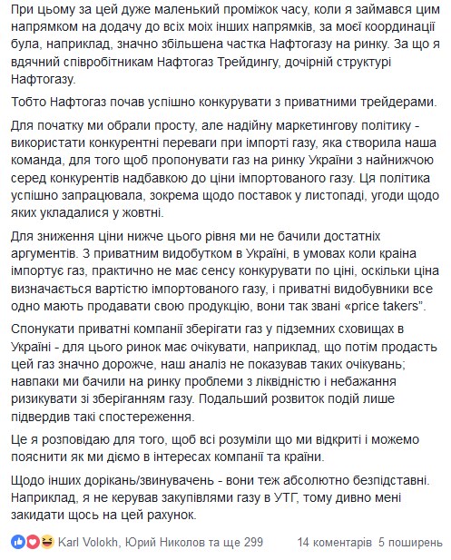 Про це він написав у Facebook у відповідь на заяву "ЕРУ Трейдинг" щодо матеріалів, опублікованих в ЗМІ про укладення між компаніями договорів на купівлю-продаж природного газу в четвертому кварталі 2018 року, пише "Економічна правда".