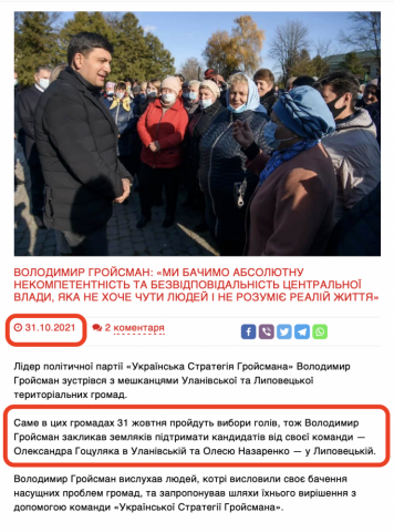 "Саме в цих громадах 31 жовтня пройдуть вибори голів, тож Володимир Гройсман закликав земляків підтримати кандидатів від своєї команди – Олександра Гоцуляка в Уланівській та Олесю Назаренко – у Липовецькій", - інформує сайт 33 каналу зранку 31 жовтня, тобто в день виборів.