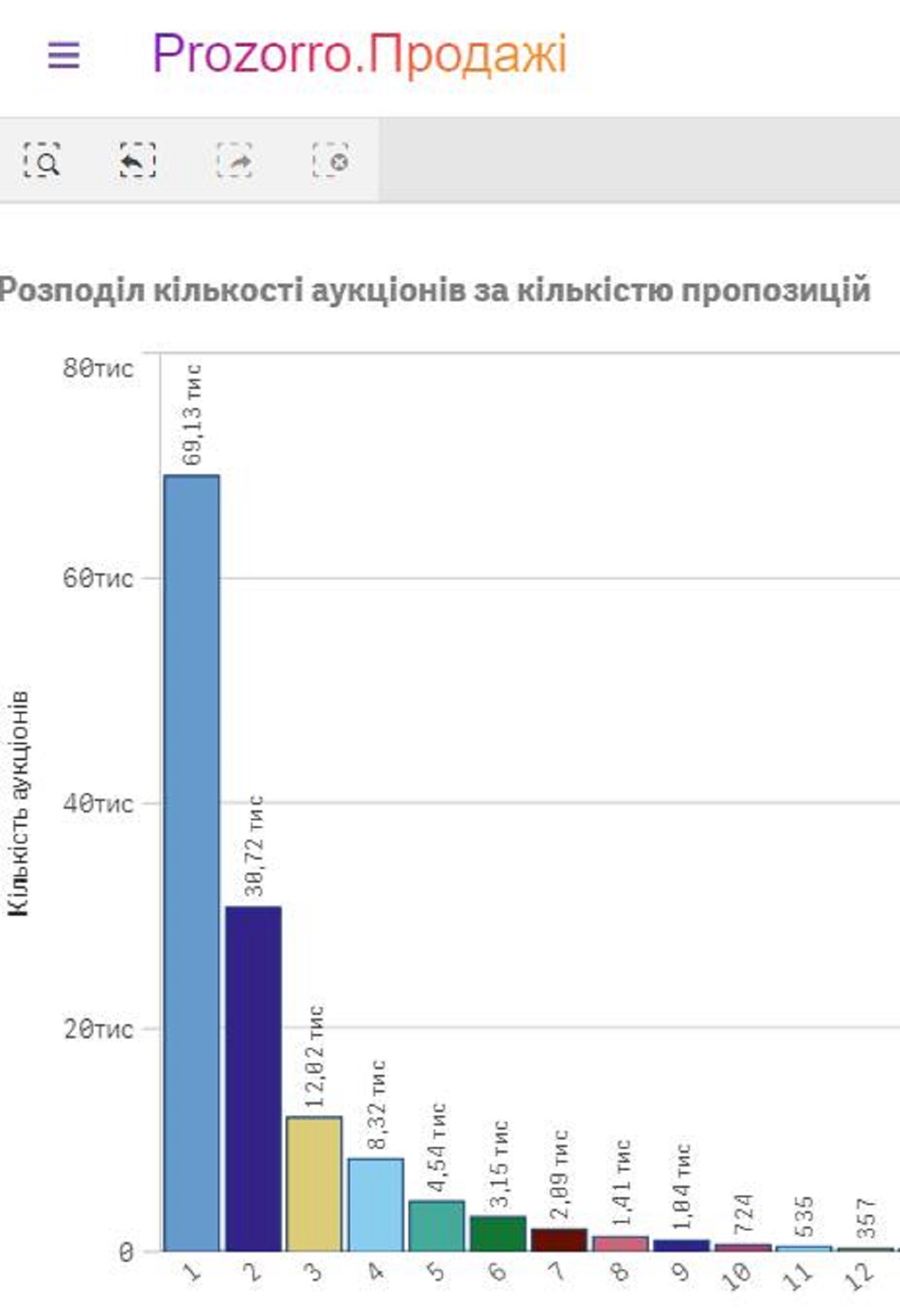 Проте відповідно до аналітичних даних з сайту Прозорро, половина "успішних" аукціонів в системі була проведена лише з одним учасником, тобто без фактичного торгу й справедливого росту ціни та збільшення доходів бюджетів різних рівнів.