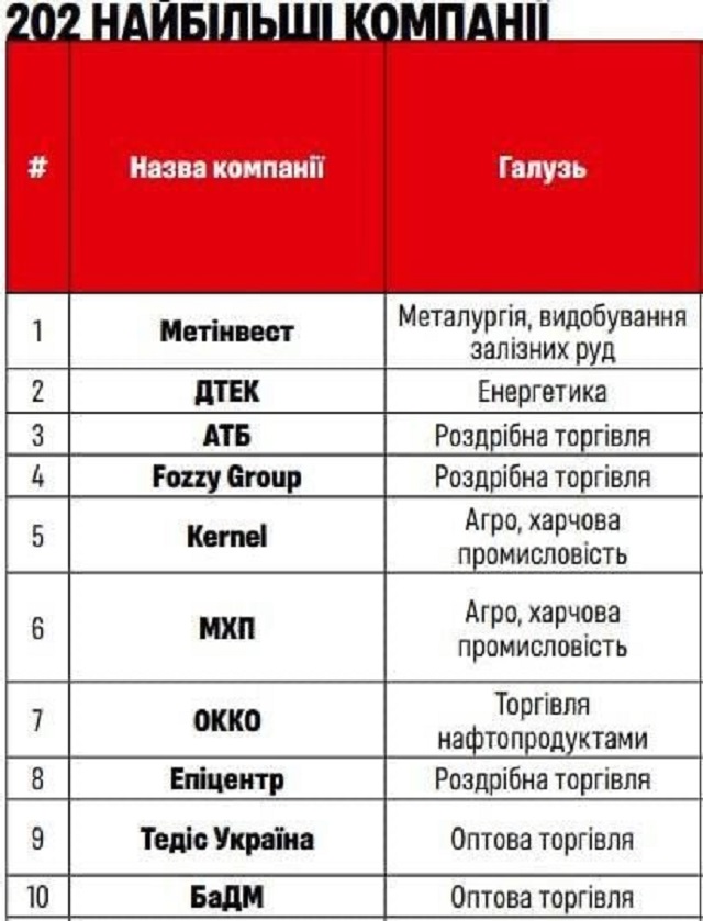 До першої п'ятірки увійшли ДТЕК, АТБ, Fozzy Group і Kernel.